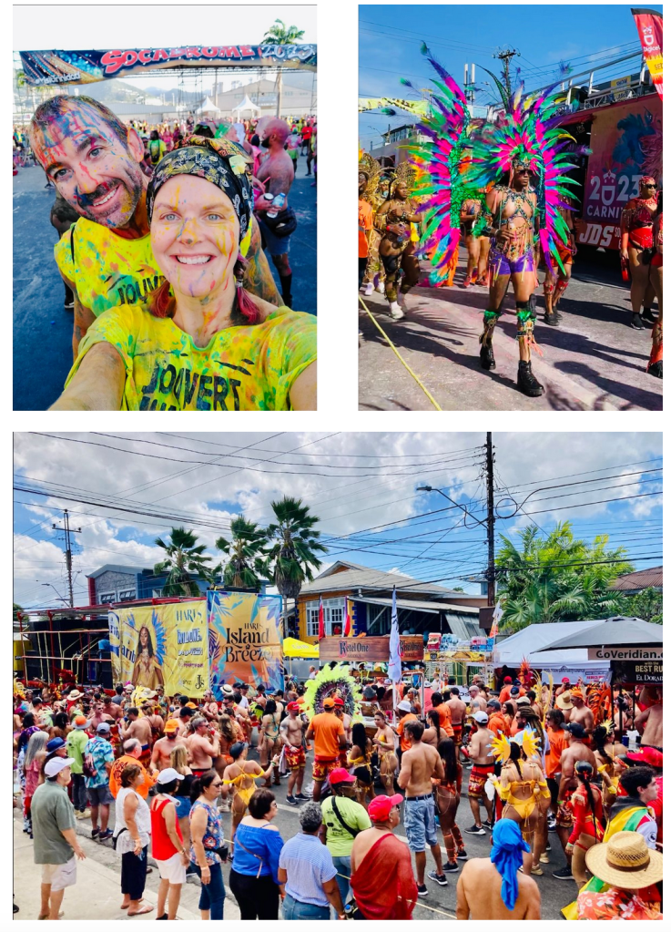 Over the first few weeks, we got situated and started some projects, but Carnival was approaching quickly, which was the main reason we picked T&T to do our boat work (don’t tell Eric)! We went to several events that dazzled our senses and filled the night hours with beautiful Soca music. Our favorite event was J’ouvert: this party begins in the early hours of the Monday before Lent. It is filled with music, paint, mud, and more! You can participate by yourself, but the best way to enjoy J’ouvert is to join a band, which we did. Then you get to walk with that band and the flatbed trucks that travel with the group carrying moving DJs, bars, bathrooms, and loads of paint and powder. With the first drink in hand at 3:30 in the morning, we put on some baby oil – to help remove whatever we would be covered in and squished into a sea of yellow shirts with the Jum-Beez band. Then we danced, drank, and laughed all the way down ‘da Road until the sun rose over Port of Spain.