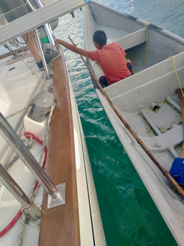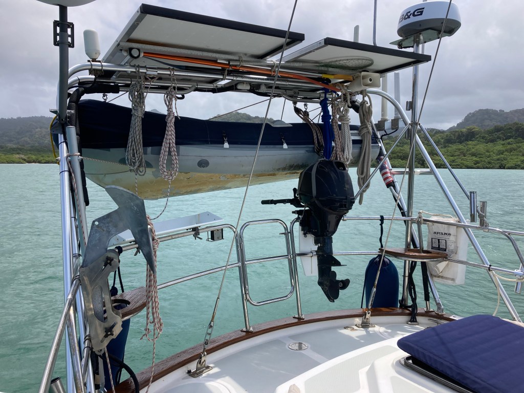 We anchored successfully and took a break to assess the conditions and our plan to lower the dinghy into the water. In Tintipán, we moved it to the back davits under the arch – thinking this option would be easier than lifting it from the forward deck, which is how we store Turtle (the dinghy) for long passages. The process started well, and we got her into the water relatively smoothly.
