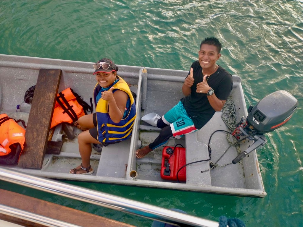The panga arrived, holding a crew of two with one passenger, all from the village next to Permé. We felt skeptical when Eric and I entered the 15-foot-long by 4-foot-wide vessel made of wood with a high, narrow bow and a low, wide stern. The boat immediately wobbled side to side as we made our way to the bench in front of the driver – no older than eighteen, his assistant was even younger. We sat on either side of Niylisa, the passenger, and motored over to the other sailboat. As the other two cruisers boarded the vessel, it tipped very far to one side, and we all started saying, “Despacio! Despacio!” This means slowly in Spanish. There were some giggles, but overall, I think we were excited. With four foreigners and three locals, we began the boat ride that Eric and I will never forget.