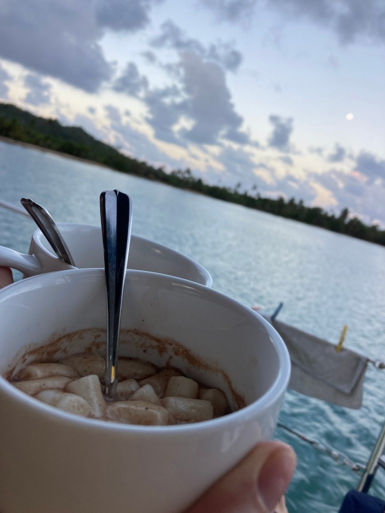Finally, we could see the masts of our sailboats and knew we were safe. Back on Oleta, we said goodbye to our new amigos, and we slowly fumbled to get inside because our fingers were numb. After a semi-hot shower (thank you, generator), I made two cups of hot chocolate that we savored and warmed our hands as we watched the fading sun behind the puffiest gray clouds.