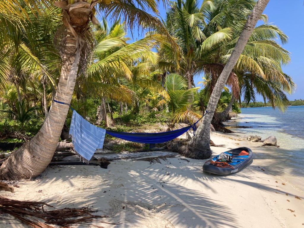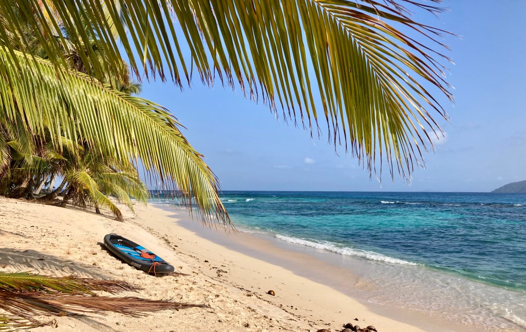 We had to navigate around a few huge coral heads to anchor in a seabed of white sand: it was worth the work! We later reflected on how much we had grown in our ability to traverse sketchy areas that had terrified us in the Bahamas. After we set the hook, we usually do a passage pick-up of the boat, but we were so excited to explore the beach before the sun went down; Eric pumped up Petunia – the paddle board, and I paddled us to shore with a couple of beers.