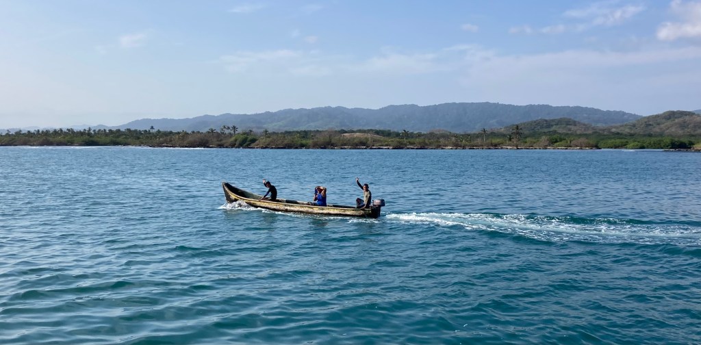 After almost two weeks in the protected mangrove bay, we were feeling the itch for some clear water so we could swim. Since we were heading directly into the wind, which was light, we motored to Isla Iguana: a small, deserted island full of coconuts, birds, and not a soul in sight! While we waved to a few passing canoes, we did not interact with anybody at this anchorage. Fishermen use two small huts on the island to stay out longer since it is a bit of a distance back to the mainland.