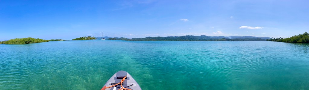 Eventually, we got the dinghy down – this was the first time since the fiasco in Port Obaldía and went on a bay tour: it was massive! What we thought were shorelines were openings to more areas of little lush islands composed solely of mangrove trees. The sun was getting low, but as we started to make our way back, we motored by a spot that was visibly shallower and led to an opening in the mangroves: this would be a place I visited three times on my board. On one paddle excursion, I heard a strange fan-like noise, and when I looked right in front of me – about thirty feet away, I saw a massive swarm of bees flying in a cloud of little black dots! It was fascinating to watch them move together to a new home. I fell in love with the mangroves on these visits and will never forget Bahía Masargandi.