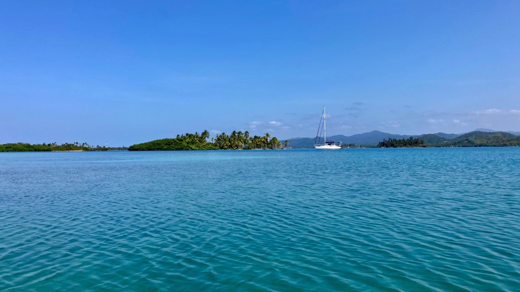 Escocés is interesting because it is around twenty feet deep throughout the bay. So, instead of tucking up close to shore where the depth usually shallows up, making it easier to anchor, we plopped the hook right in the middle. That first evening of our ten-day stay, a few locals in a canoe came over to us to collect an anchor fee and sell us some plantains and lobsters. Each place is different regarding fees: some cost and some areas are free. We have paid anywhere from 10-20 USD for an entire stay – unlike some places in the East Caribbean, where mooring balls are 40 USD a night!