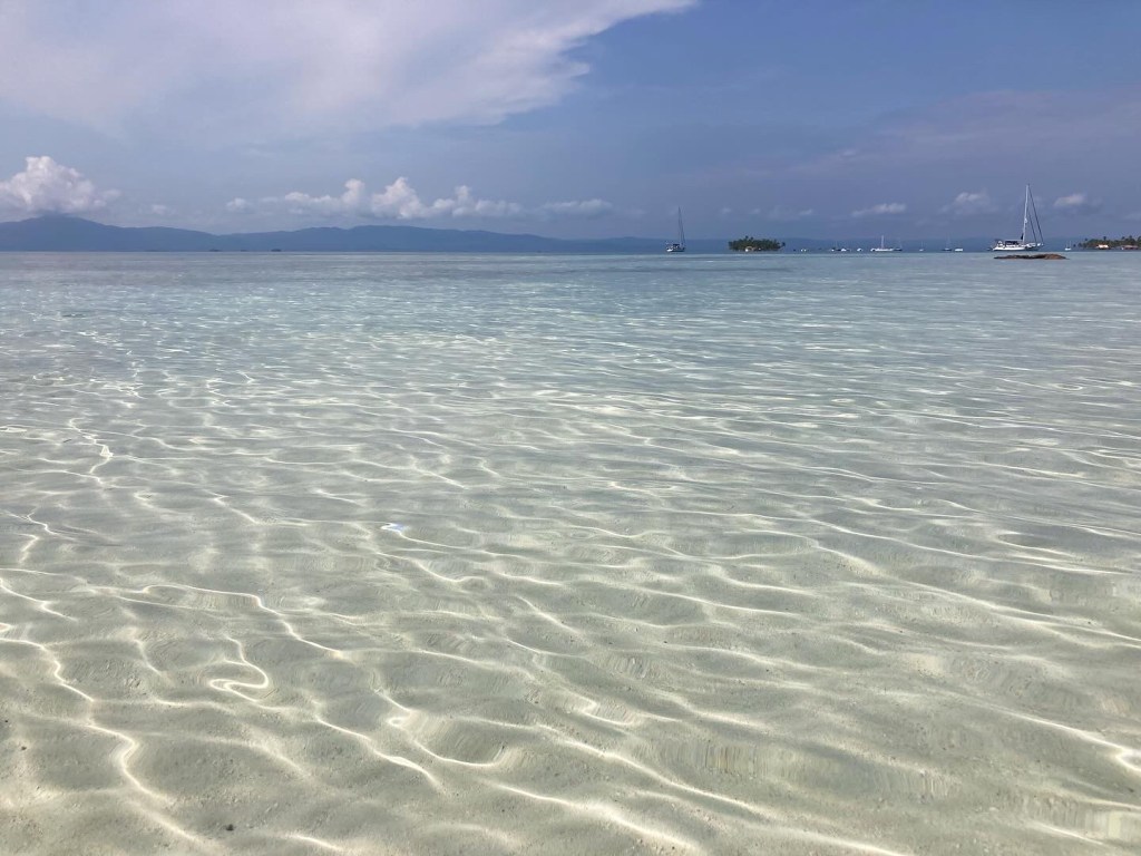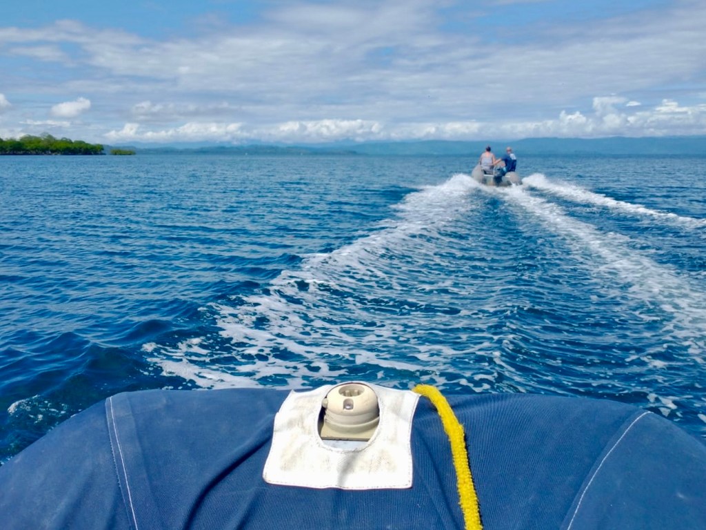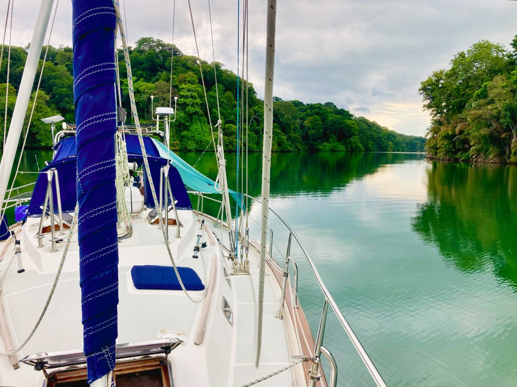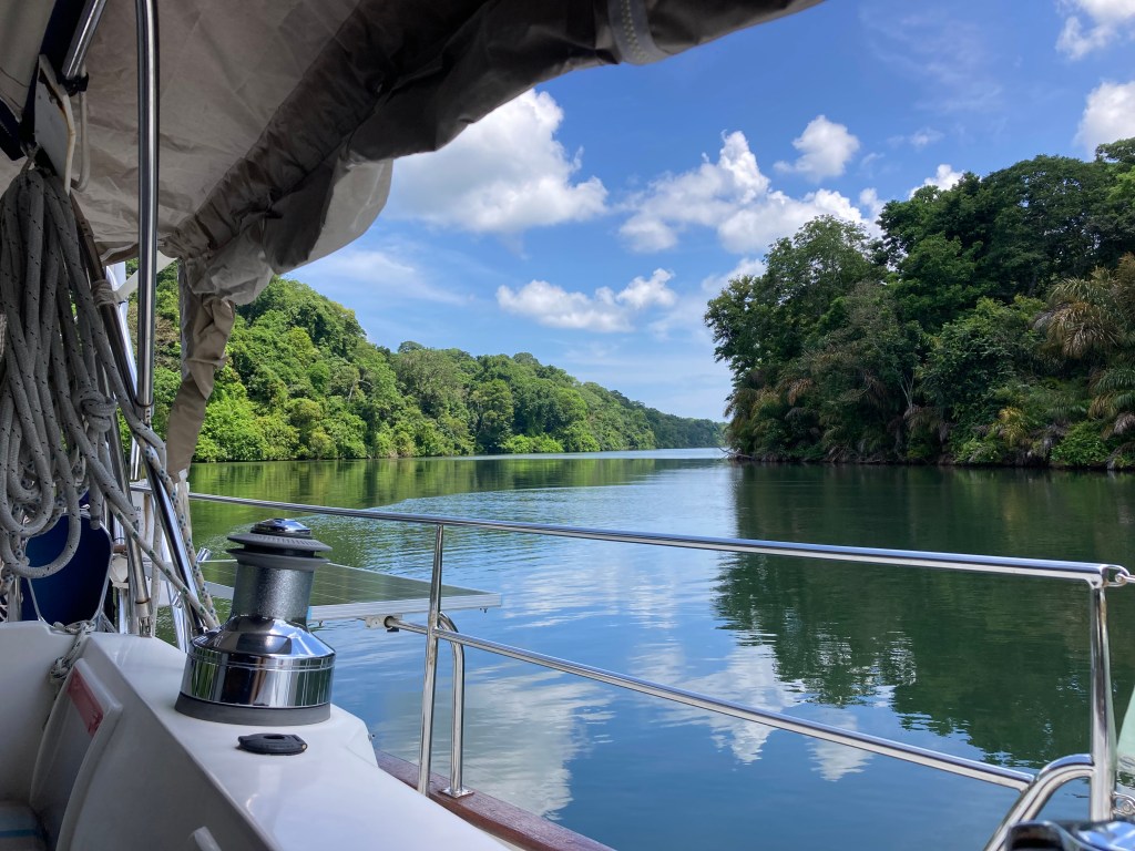 We spent seven nights and eight days on the river, enjoying the sounds of the jungle and the tranquil waters. We set up our big tent, and I would sit in the cockpit, listening to music and admiring the surroundings. It was super steamy with little breeze, so I almost always had a fan pointed at me! We took our dinghy, Turtle, to see the dam that created Lake Gatun, which is a part of the Panama Canal lock system. We also explored the small mangrove channels, keeping an eye out for crocodiles and howler monkeys while enjoying the bird calls. After our week stay, we were ready to move on to a place where we could go for a swim.