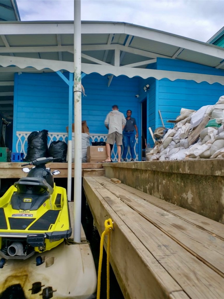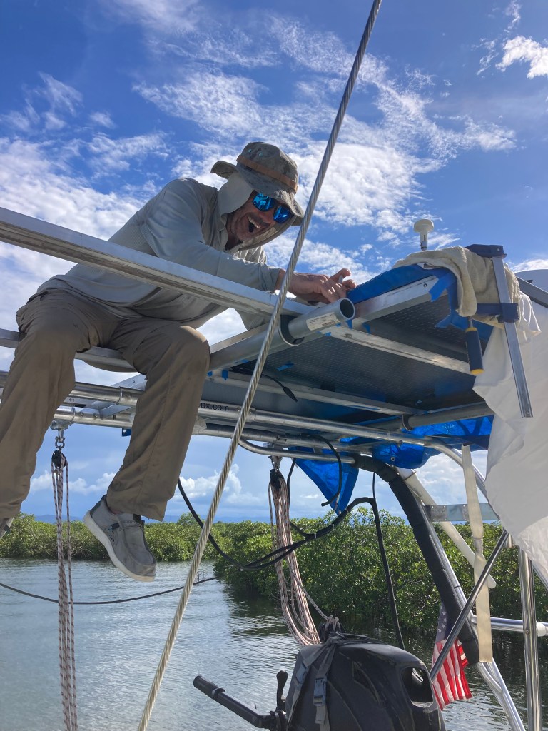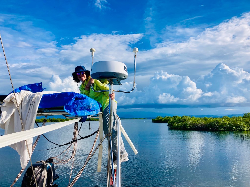 While working on my last blog post many months ago, I noticed the words on the computer screen looked fuzzy. I now have my first pair of reading glasses after a visit to the local eye doctor for an exam that cost $9, a pair of frames under $100, and a follow-up visit at no extra charge! I finally grew a successful batch of sprouts in a jar, adding delicious flavor to our meals. While we can get many items in Bocas, we only anchor by town during the day and then move to a secluded area. When the weather is nice, we dinghy over from one of our favorite spots, grab some provisions, and enjoy a delicious burger from Smash Burgers or try new hot sauces on our tacos at La Taqueria-bdt. The photo of Eric on a dock with the jet ski shows how we pick up our packages while on the dinghy. We added new solar panels to the back arch, and while it was hot and buggy, we did it by ourselves, a theme that will continue in another post.